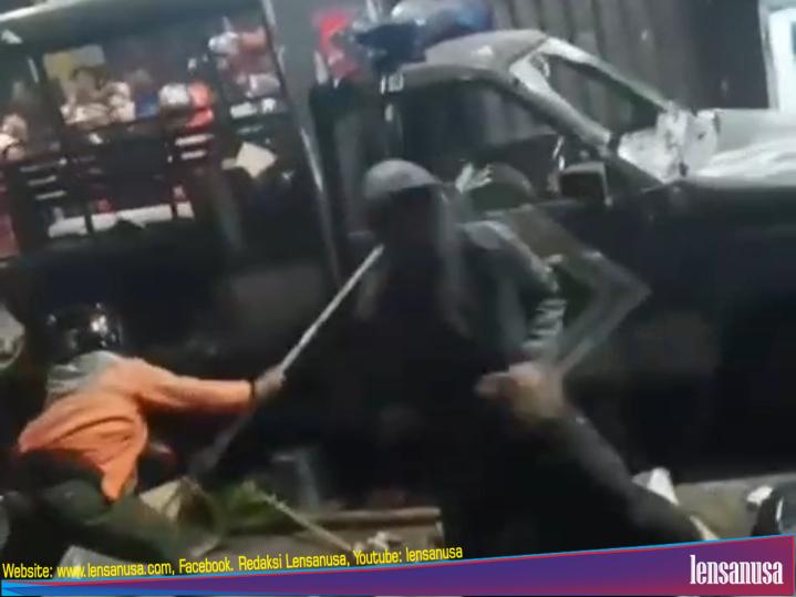 “Mobil (polisi) kita juga tadi sempat diseret di jalan, digulingkan. Terus kaca-kaca dipukulin semua, lampu rotator di atas juga tadi dicopot,” ujar Agha.