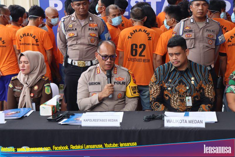 Pengungkapan kasus tindak kejahatan Narkoba di wilayah hukum Polrestabes Medan sepanjang Bulan Januari tahun 2025 ini. Para pelaku ditangkap berbagai tempat di Medan dan Deli Serdang. Sedangkan terduga pelakunya sebanyak 76 orang, tersangka sebanyak 55 orang terdiri dari 53 laki – laki dan 2 orang perempuan. “Penyalahgunaan sebanyak 21 orang,, 12 orang direhabilitasi di BNN dan 9 orang direhabilitasi ke panti rehabilitasi Fokus Indonesia. ” ucap Kapolrestabes Medan Kombes Pol Gidion Arif Setyawan didampingi Walikota Medan Bobby Afif Nasution, Dan Pomdam 1 Bukit Barisan, Kajari Medan, Dandim 02/01 Medan, ,Kabid Propam Polda Sumut dan pejabat lainnya, Kamis (23/1/2025).