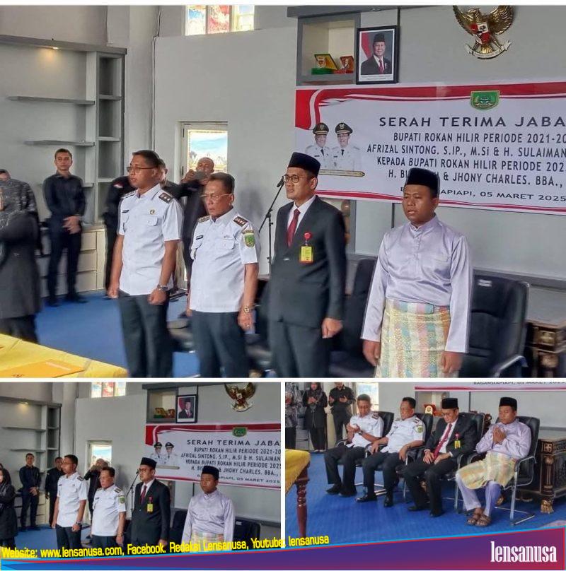 LENSANUSA.COM | BAGANSIAPIAPI, 5 Maret 2025 – Pemerintah Kabupaten Rokan Hilir menggelar acara serah terima jabatan Bupati dan Wakil Bupati periode 2025-2030 di lantai 8 Kantor Bupati Rokan Hilir, Bagansiapiapi. Dalam acara ini, kepemimpinan secara resmi beralih dari Afrizal Sintong, S.IP., M.Si., dan H. Sulaiman, SS., MM., kepada H. Bistamam dan Jhony Charles, BBA., MBA.