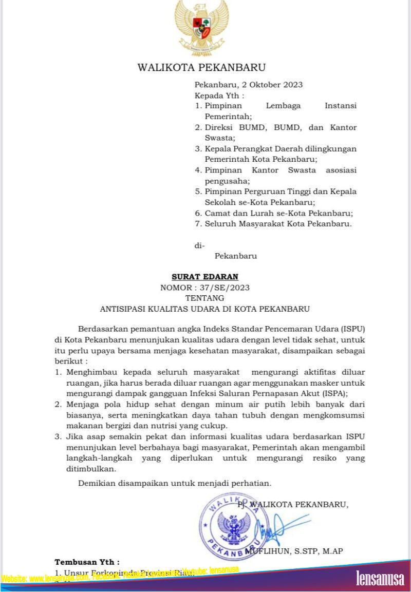 PEKANBARU | LENSANUSA.COM – Penjabat (Pj) Wali Kota Pekanbaru Muflihun telah menerbitkan surat edaran dalam menyikapi kabut asap yang semakin parah. Dalam surat edaran itu, masyarakat Pekanbaru diimbau agar membatasi aktivitas di luar rumah.