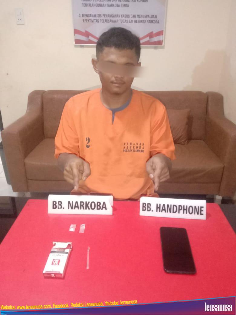 LENASANUSA.COM | TAMBANG –Tim Satnarkoba Polres Kampar tangkap seorang pelaku narkoba berinisial HE (31) warga Desa Sungai Pinang, Kecamatan Tambang, Selasa (16/7/2024) sekira pukul 16.30 Wib.