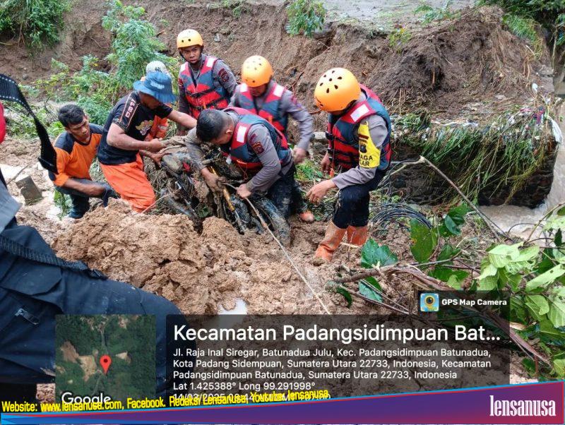 Tidak hanya fokus membersihkan jalan, personel Brimob juga terlibat dalam proses evakuasi kendaraan yang tertimbun. Sebuah sepeda motor Honda CBR 150 cc yang terseret dan jatuh ke jurang sedalam sekitar lima meter berhasil diangkat dengan aman oleh tim Brimob Polda Sumut.