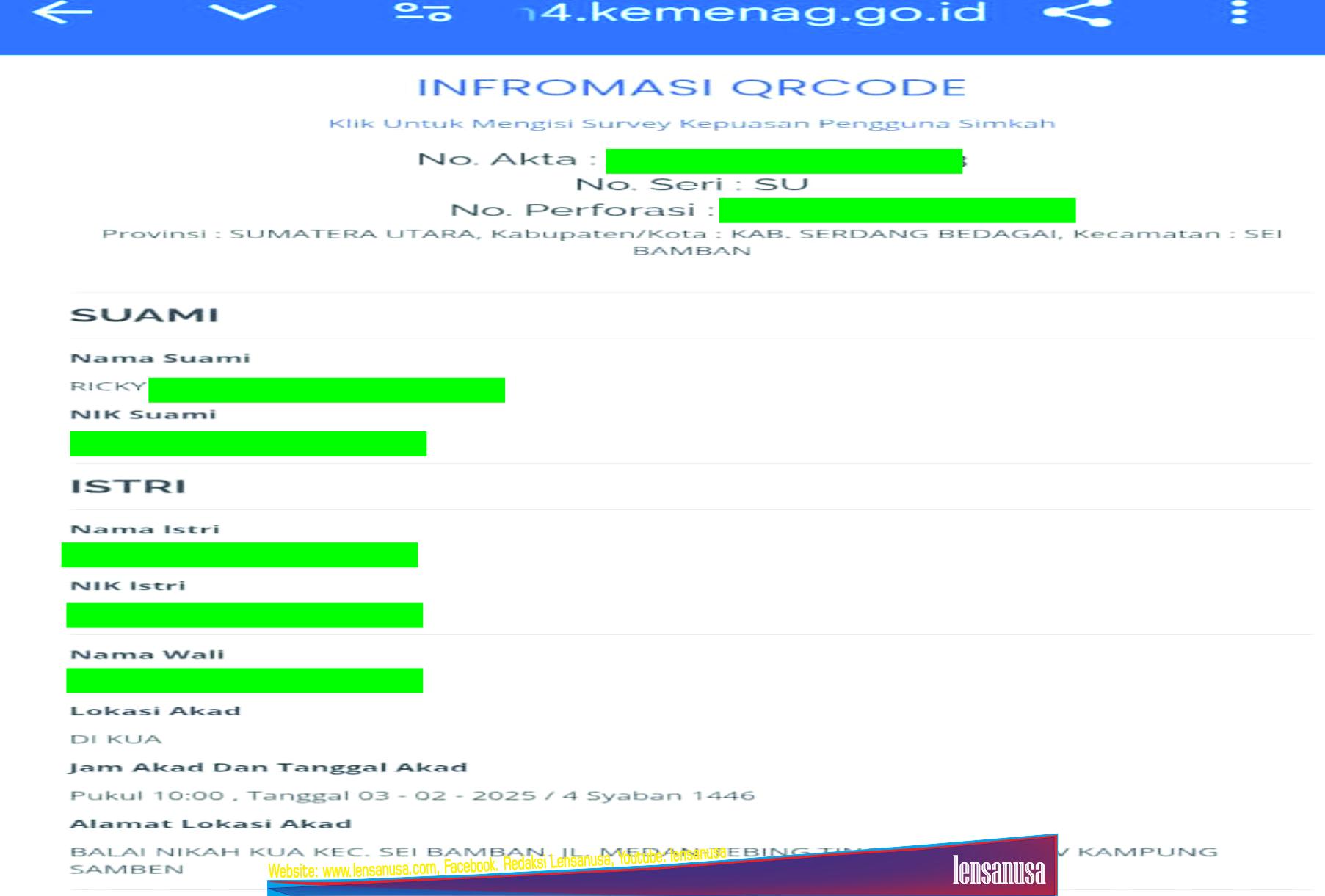 Anehnya, pernikahan itu diketahui terlaksana di luar Balai Nikah KUA. Saat dicek aplikasi SIMKAH milik Kementrian Agama, tempat Pernikahan Ricky diduga direkayasa menjadi di Balai Nikah KUA Sei Bamban, sehingga sesuai aturan tidak dikenakan biaya alias gratis. Padahal, Korban telah menyetorkan uang administrasi sebesar Rp. 1.050.000.