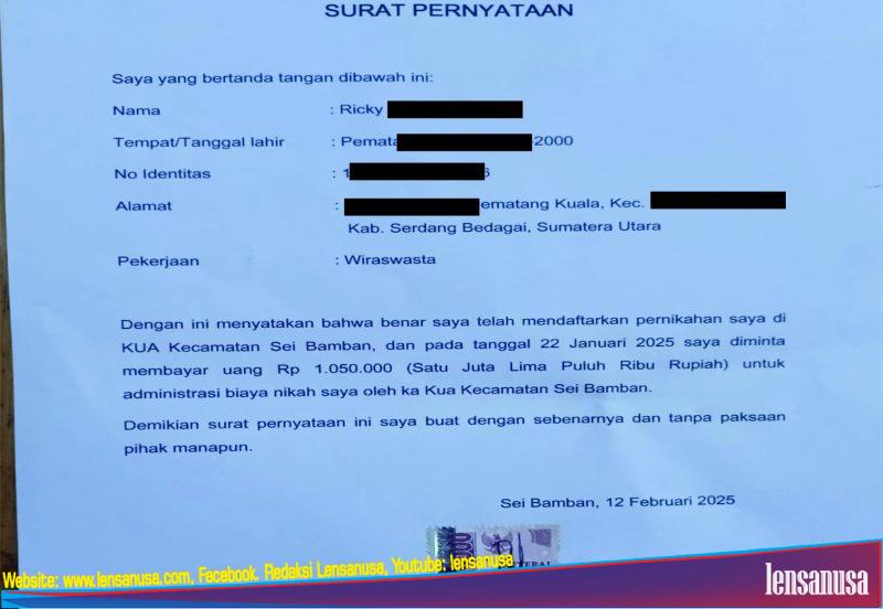 “Saya diminta membayar uang Rp 1.050.000 (Satu Juta Lima Puluh Ribu Rupiah) untuk administrasi biaya nikah saya oleh ka Kua Kecamatan Sei Bamban,” kata Ricky dalam pernyataan resminya.