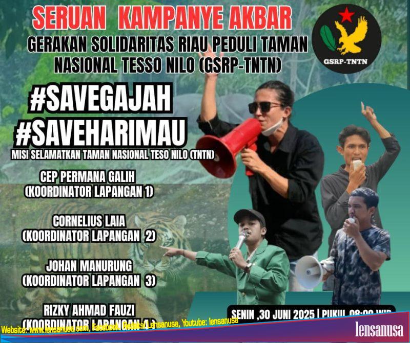 PEKANBARU | LENSANUSA.COM – 27 Juni 2025- Gerakan Solidaritas Riau Peduli Taman Nasional Tesso Nilo (GSRP-TNTN) akan menggelar kampanye akbar penyelamatan lingkungan pada Senin, 30 Juni 2025 mendatang, di depan Kantor Gubernur Riau. Aksi ini menjadi momen penting bagi masyarakat sipil Riau dalam menyuarakan penyelamatan ekosistem TNTN, rumah terakhir bagi Harimau dan Gajah Sumatera.