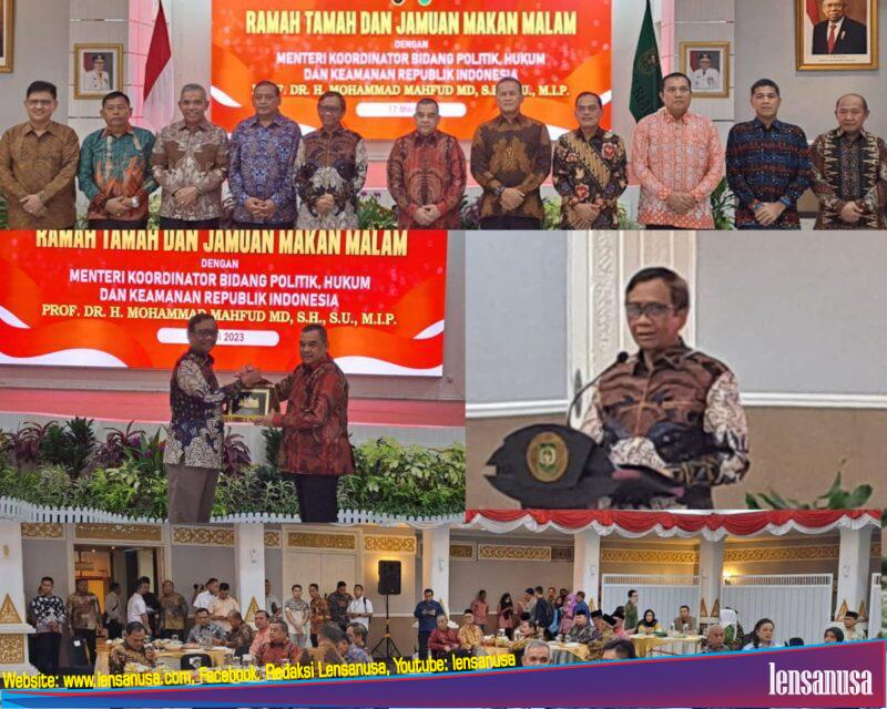 Selanjutnya, penyampaian Kata Sambutan yang disampaikan oleh Menteri Koordinator Politik Hukum dan Keamanan Republik Indonesia Prof. Dr. Mohammad Mahfud MD., S.H., S.U., M.I.P. Dalam penyampaiannya, Menteri Koordinator Politik Hukum dan Keamanan Republik Indonesia Prof. Dr. Mohammad Mahfud MD., S.H., S.U., M.I.P menyampaikan bahwa Kegiatan pada malam hari ini adalah ramah tamah dan saling bertukar pikiran, untuk menjalin tali silaturahmi dan menjaga negara kita ini agar selalu nyaman dan tentram.