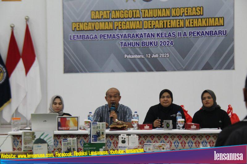 PEKANBARU | LENSANUSA.COM – Seluruh pegawai Lembaga Pemasyarakatan (Lapas) Kelas IIA Pekanbaru mengadakan kegiatan Rapat Anggota Tahunan (RAT) Tahun Buku 2024. Bertempat di Aula Sahardjo Lapas Pekanbaru, RAT kali ini dihadiri oleh Pembina Koperasi yang juga selaku Kepala Lapas Pekanbaru, Erwin Fransiskus Simangunsong, Ketua, Pengurus, dan Pengawas serta Anggota Koperasi Pegawai Lapas Pekanbaru, Sabtu (12/07/25).